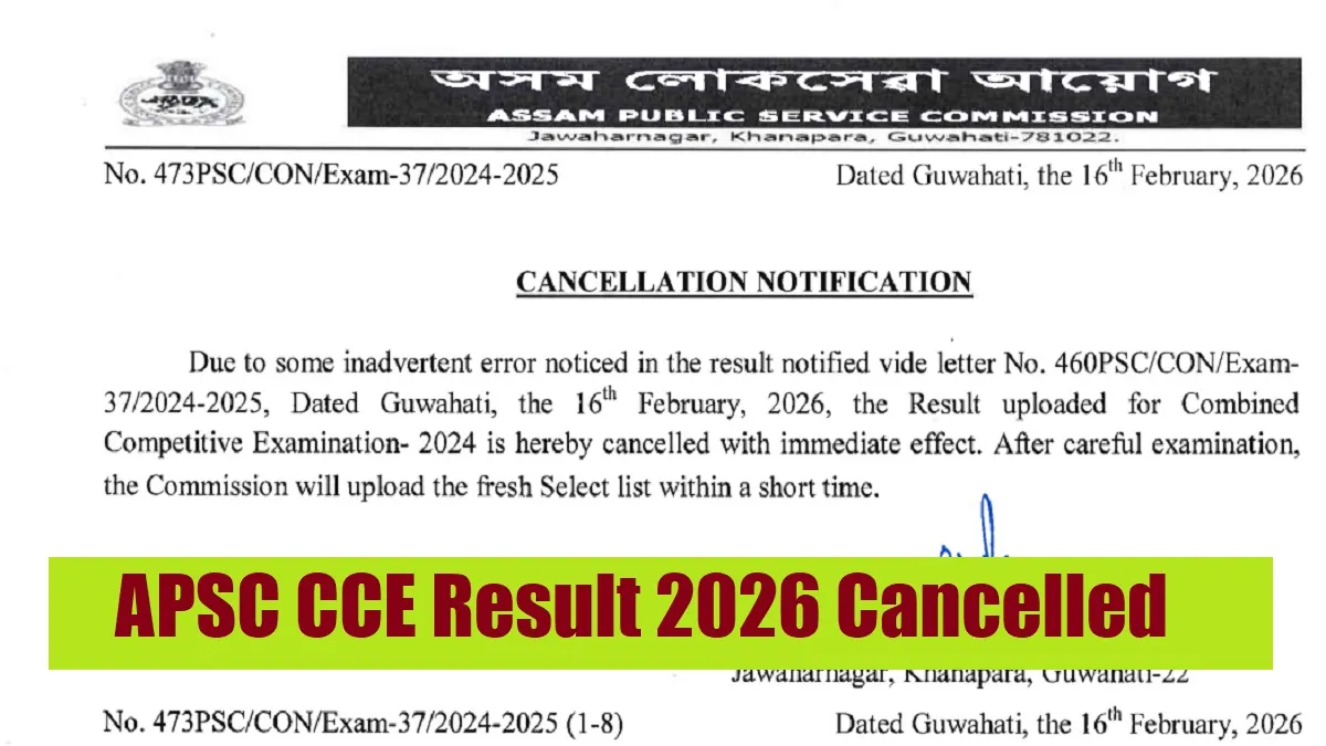 The short notice further says, "Due to some inadvertent error noticed in the result notified vide letter No. 460PSC/CON/Exam3712024-2025, Dated Guwahati, the 16th February, 2026, the Result uploaded for Combined Competitive Examination- 2024 is hereby cancelled with immediate effect. After careful examination, the Commission will upload the fresh Select list within a short time."