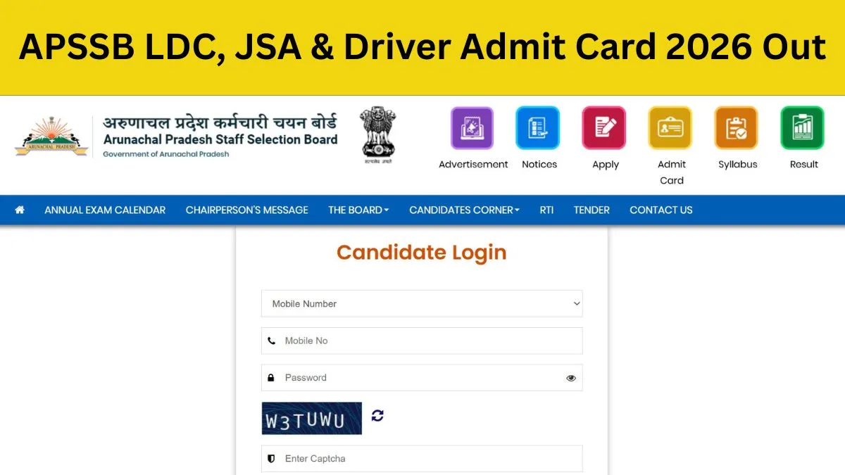 The Arunachal Pradesh Staff Selection Board (APSSB) released the APSSB Admit Card 2026 for LDC, Driver, and JSA posts. Registered candidates can now download their admit cards online using their registration number and password. The APSSB Combined Limited Departmental Competitive Examination (CLDCE) is scheduled to be held on March 29. The admit card acts as an entry pass to the examination hall. Candidates must verify their identity to enter the examination hall. Get the direct APSSB CLDCE Admit Card 2026 download link along with the exam schedule here.