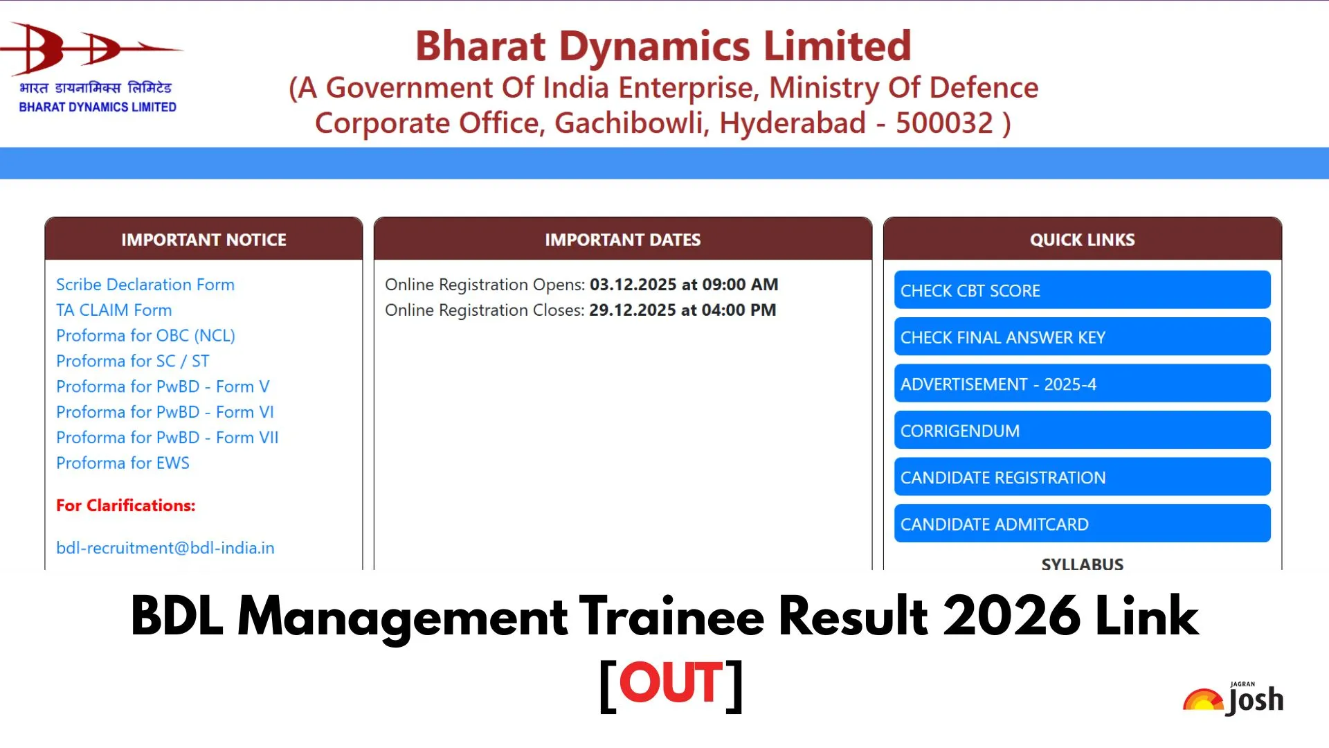 BDL Management Trainee Result 2026 OUT: भारत डायनेमिक्स लिमिटेड (BDL) ने बीडीएल मैनेजमेंट ट्रेनी रिजल्ट जारी कर दिया है। रिजल्ट और स्कोर कार्ड आज 29 जनवरी 2026 को आधिकारिक वेबसाइट bdl-india.in पर उपलब्ध है। जिन उम्मीदवारों ने मैनेजमेंट ट्रेनी भर्ती परीक्षा में भाग लिया था, वे अब अपना परिणाम ऑनलाइन देख और डाउनलोड कर सकते हैं।