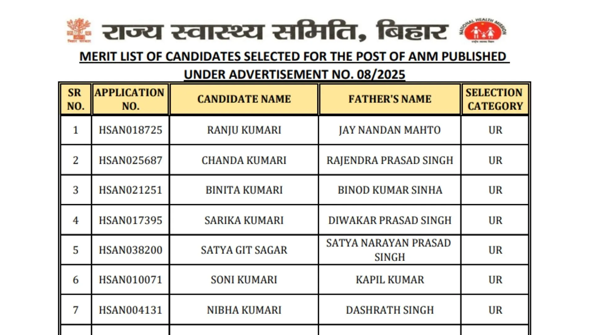 | Bihar SHS ANM Merit List 2026 PDF Link | |
