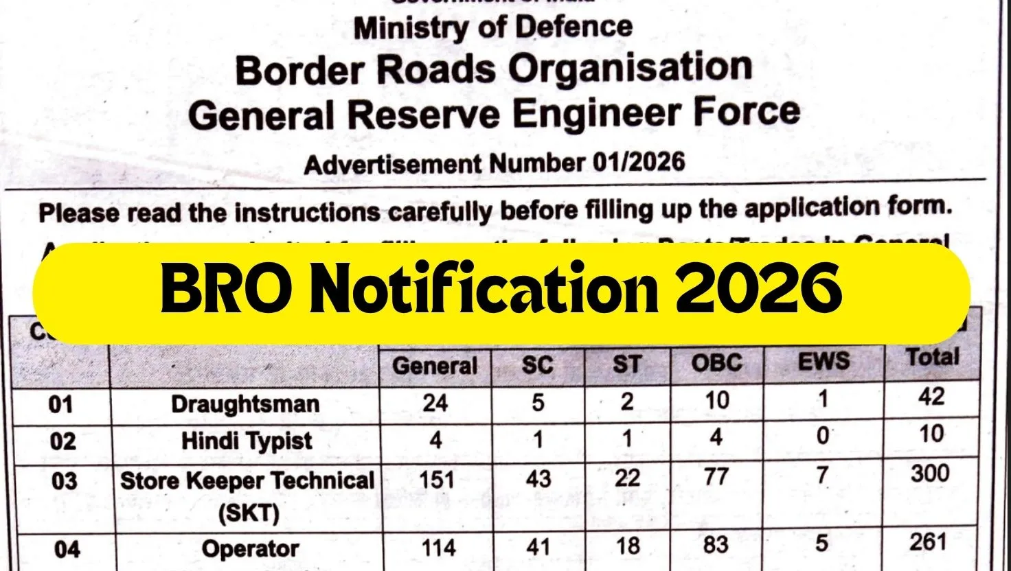 BRO Recruitment 2026: The Border Roads Organisation (BRO) has issued a short notification for 2026 under Advertisement No. 01/2026 for the recruitment of candidates for the 899 posts across 6 trades within the General Reserve Engineer Force (GREF). These posts include positions such as Draughtsman, Hindi Typist, Store Keeper Technical (SKT), Operator Communication, Operator Excavating Machinery (OEM), and Electrician, among others.