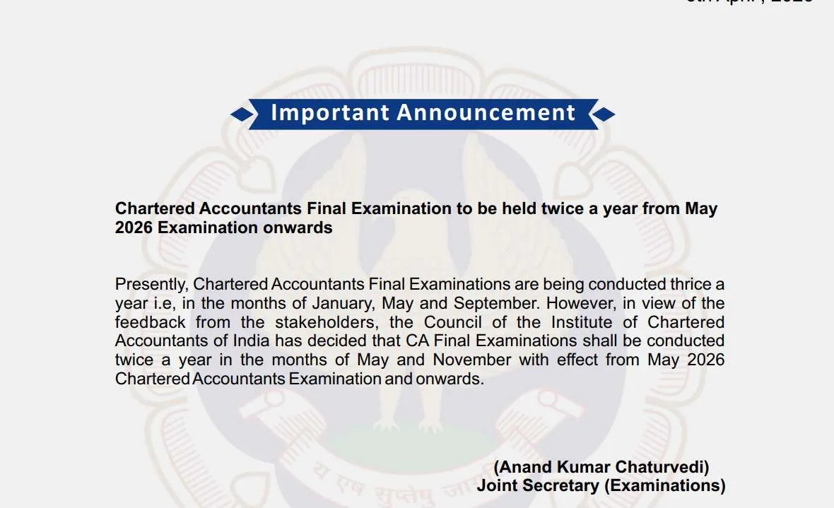 ICAI ने एक और चौंकाने वाला फैसला लिया है। पिछले कुछ समय से चल रही तीन बार एग्जाम की चर्चाओं के बीच, अब यह स्पष्ट कर दिया गया है कि CA Final के एग्जाम साल में दो बार आयोजित किए जाएंगे।