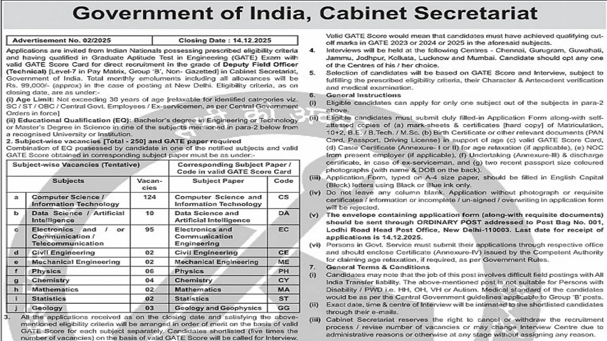 Cabinet Secretariat Recruitment 2025: Government of India, Cabinet Secretariat (CS) has invited online application for Deputy Field Officer (Technical) positions under Advertisement No. 02/2025. A total of 250 Deputy Field Officer (Technical) positions are to be filled through the recruitment drive under the Pay Level-7, with a basic pay of Rs. 44,900 and gross emoluments approaching Rs. 99,000. Interested and eligible candidates can apply online for these posts on or before December 14, 2025.
