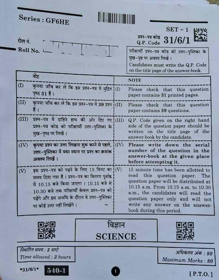 CBSE Class 10 Science Question Paper 2025 (Set-1) FREE PDF Download |