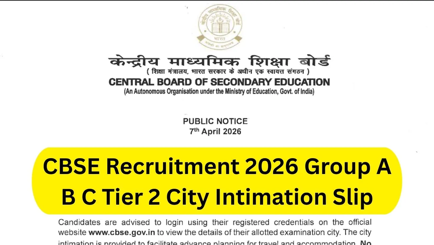 CBSE has released the official notice for CBSE Group A B C City Slip date 2026. The candidates can download the notice from the direct link provided here.