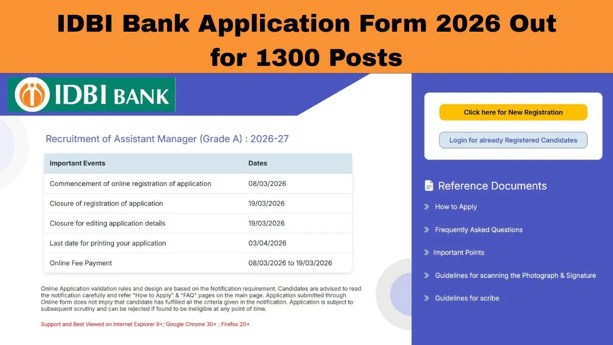 IDBI has started the IDBI Bank Recruitment 2026 registration process for multiple managerial posts. The bank has announced a total of 1,300 vacancies for Junior Assistant Manager (Grade O – Regional) and Assistant Manager (Grade A) positions. Interested candidates who meet the eligibility requirements can submit their applications through the direct link provided below.