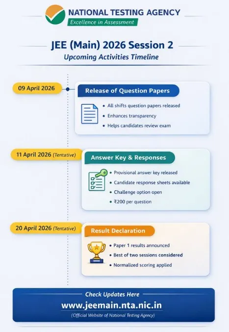 नेशनल टेस्टिंग एजेंसी (NTA) ने JEE Main 2026 सेशन 2 के एग्जाम खत्म होने के साथ ही महत्वपूर्ण डेट्स का ऐलान कर दिया गया है। देश के प्रतिष्ठित इंजीनियरिंग संस्थानों में ए़डमिशन लेने का सपना देख रहे छात्रों के लिए यह इंपोर्टेंट नोटिस है। इंजीनियरिंग एंट्रेंस एग्जाम का दूसरा सेशन यानी अप्रैल सेशन के एग्जाम 2 अप्रैल से 8 अप्रैल तक आयोजित किए गए थे। एग्जाम में शामिल हुए छात्र अब ऑफिशियल वेबसाइट jeemain.nta.nic.in पर जाकर अपनी आंसर-की को देखकर डाउनलोड कर सकते हैं।