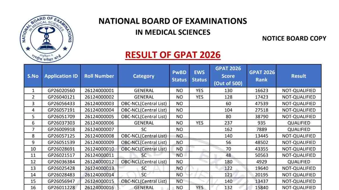 NBEMS GPAT Rank List 2026 OUT: नेशनल बोर्ड ऑफ एजुकेशन इन मेडिकल साइंस (NBEMS) ने GPAT 2026 की ऑफिशियल रैंक लिस्ट आज घोषित कर दी गई है। वे सभी छात्र जिन्होंने 7 मार्च 2026 को आयोजित ग्रेजुएट फार्मेसी एप्टीट्यूड टेस्ट दिया था, वह अब ऑफिशियल वेबसाइट natboard.edu.in पर जाकर अपनी रैंक और स्कोर चेक कर सकते हैं। यह रैंक लिस्ट भारत के प्रतिष्ठित फार्मेसी कॉलेजों (M.Pharm) में एडमिशन के लिए सबसे महत्वपूर्ण दस्तावेज है।