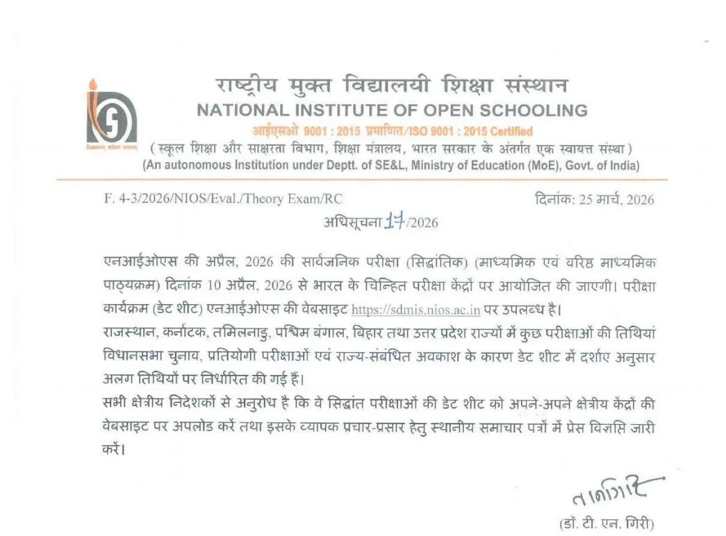 NIOS अप्रैल 2026 एग्जाम डेटशीट : महत्वपूर्ण नोट