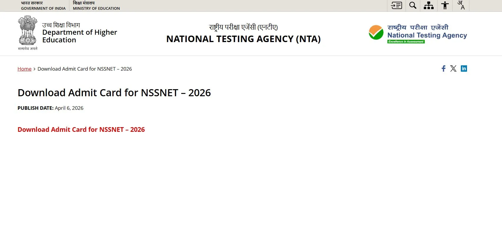 - होमपेज पर "Download Admit Card for NSSNET – 2026" के लिंक को चुनें।