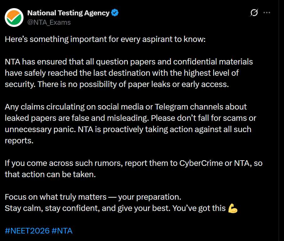 NTA ने छात्रों से अपील की है कि वे अपनी मेहनत पर भरोसा रखें और एग्जाम के आखिरी टाइम में इन अफवाहों से विचलित न हों।