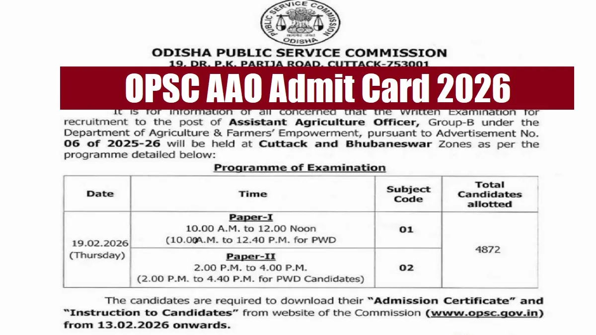 OPSC AAO Admit Card 2026: The Odisha Public Service Commission (OPSC) is all set to release the OPSC AAO Admit Card 2026 today i.e. on February 13, for the posts of Assistant Agriculture Officer. The Commission will be conducting the written exam on February 19, 2026 (Thursday) across the state. All those candidates who have to appear in the AAO written exam can download their admission certificate and instruction to candidates from the Commission's website- www.opsc.gov.in.