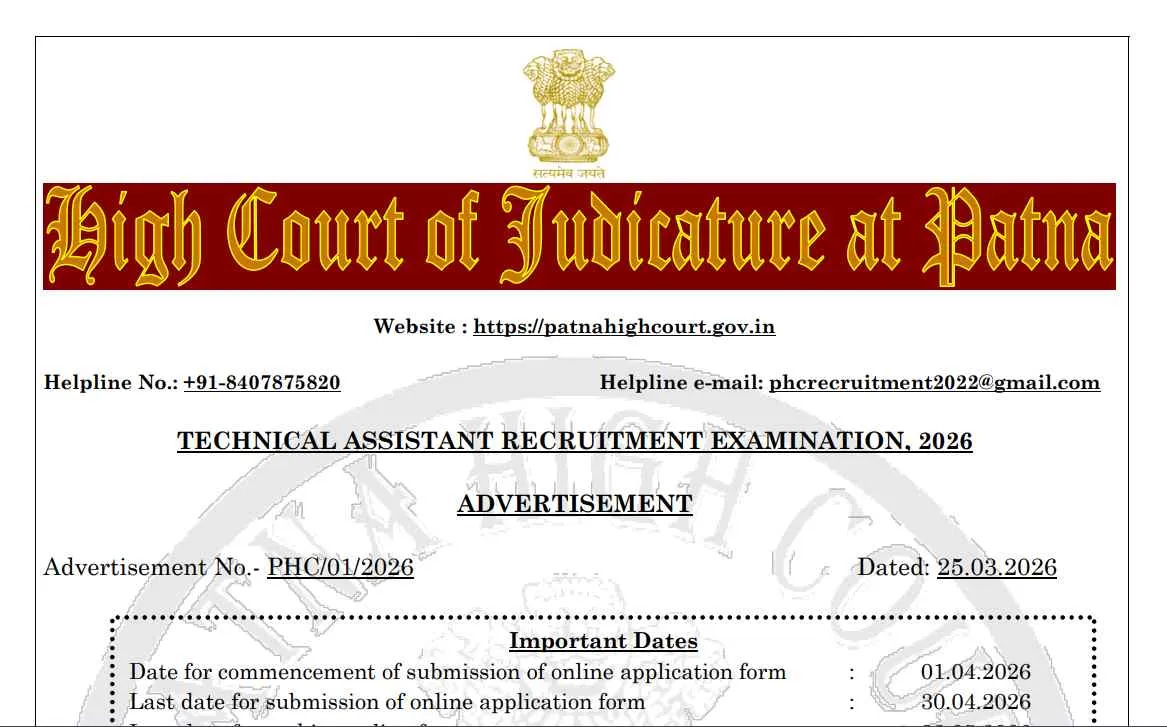 Patna High Court Recruitment 2026: पटना हाई कोर्ट ने टेक्निशियन असिस्टेंट भर्ती परीक्षा 2026 के लिए ऑफिशियल नोटिफिकेशन जारी कर दिया है। इस भर्ती अभियान का उद्देश्य ग्रुप सी पद के लिए कुल 53 रिक्तियां उपलब्ध हैं। इच्छुक उम्मीदवार 53 टेक्निशियन असिस्टेंट ग्रुप सी पदों के लिए आवेदन आमंत्रित किए हैं। संंबंधित भर्ती के लिए उम्मीदवारों का चयन लिखित परीक्षा, डॉक्यूमेंट वेरिफिकेशन और मेडिकल टेस्ट के जरिए किया जाएगा।
