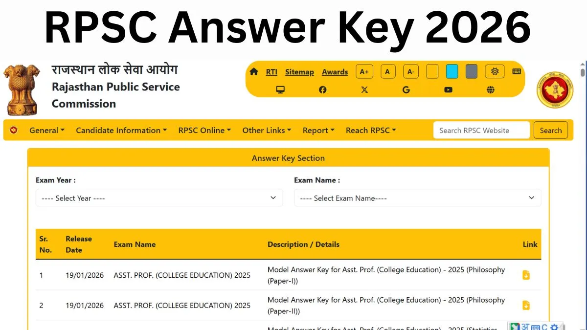 RPSC Answer Key 2026: राजस्थान लोक सेवा आयोग (RPSC) ने असिस्टेंट प्रोफेसर (कॉलेज शिक्षा विभाग) परीक्षा-2025 के अलग-अलग विषयों की आंसर-की जारी कर दी है. उम्मीदवार आधिकारिक वेबसाइट rpsc.rajasthan.gov.in से या इस पेज पर दिए गए लिंक से उत्तर कुंजी डाउनलोड कर सकते हैं. परीक्षा का आयोजन 16 से 19 दिसंबर 2025 तक किया गया था। आंसर-की ऑफिशियल वेबसाइट पर उपलब्ध है ताकि उम्मीदवार अपने उत्तरों को वेरिफाई कर सकें और संभावित स्कोर का अनुमान लगा सकें। RPSC ने 21 जनवरी से 23 जनवरी 2026 तक ऑनलाइन आपत्ति दर्ज कराने की सुविधा भी शुरू कर दी है।