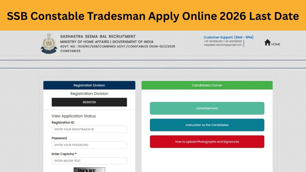 SSB Constable Tradesman Last Date 2026: The Sashastra Seema Bal (SSB) is going to close the registration process for SSB Constable Tradesman 2026 exam today, April 20. Candidates who are yet to apply can submit their forms on ssb.gov.in. Through this recruitment drive, a total of 1194 vacancies will be filled for Constable Tradesman, Driver, Head Constable, Staff Nurse and other posts. In this article, we have mentioned everything you need to know about the SSB Constable Tradesman Recruitment 2026, including important dates, vacancies, steps to apply, fees and more.