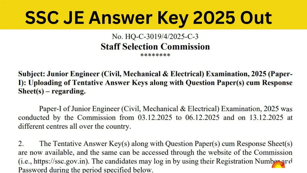 SSC JE Answer Key 2025 Out at ssc.gov.in: The Staff Selection Commission has released the SSC JE 2025 Answer Key for Paper 1. Candidates who appeared for the SSC JE Tier 1 exam, held from December 3 to 6 and on December 13, can download their provisional answer key from the official website, ssc.gov.in. They can download their SSC JE answer key by logging in with their registration number and password.