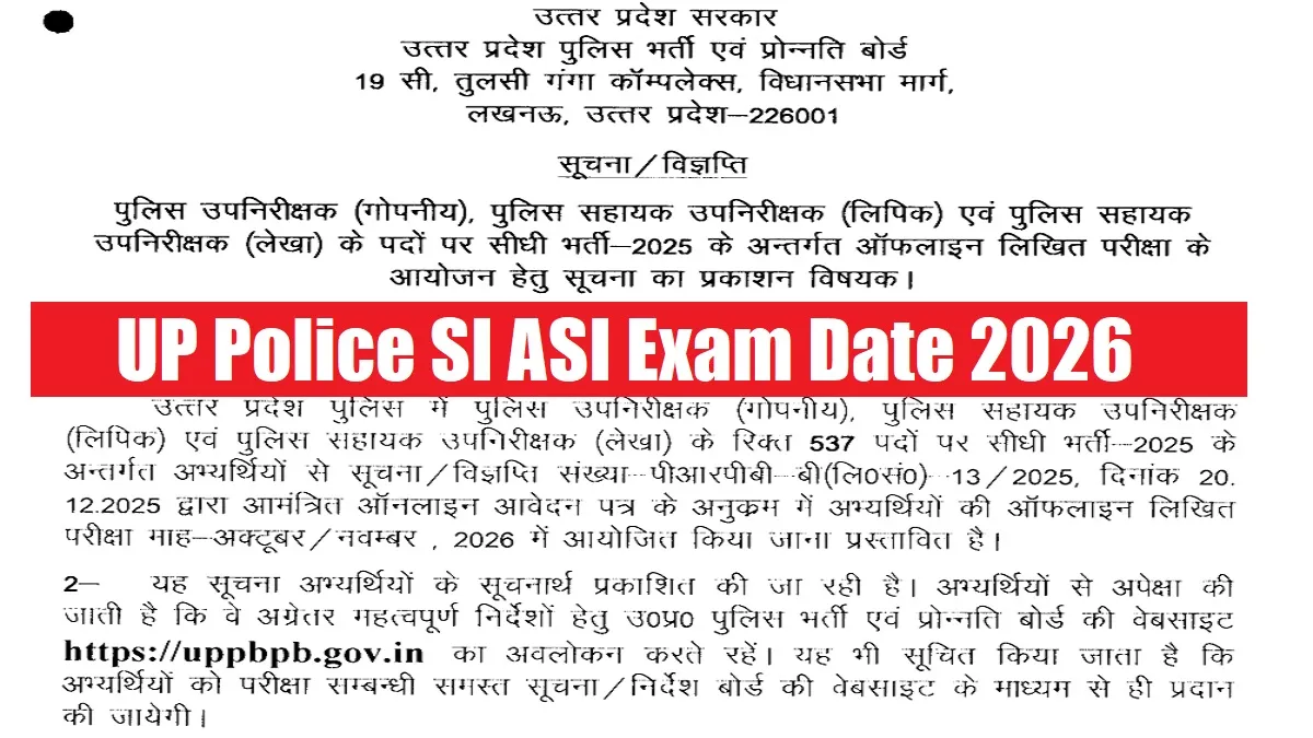 UP Police SI ASI Exam Date 2026: The Uttar Pradesh Police Recruitment and Promotion Board (UPPRPB) has released the detailed exam schedule for the posts of Police Sub-Inspector (Confidential), Assistant Sub-Inspector of Police and others. The Board will conduct the written exam for these posts tentatively in October or November 2026. The exam for a total of 537 vacant positions will be conducted in offline mode.
