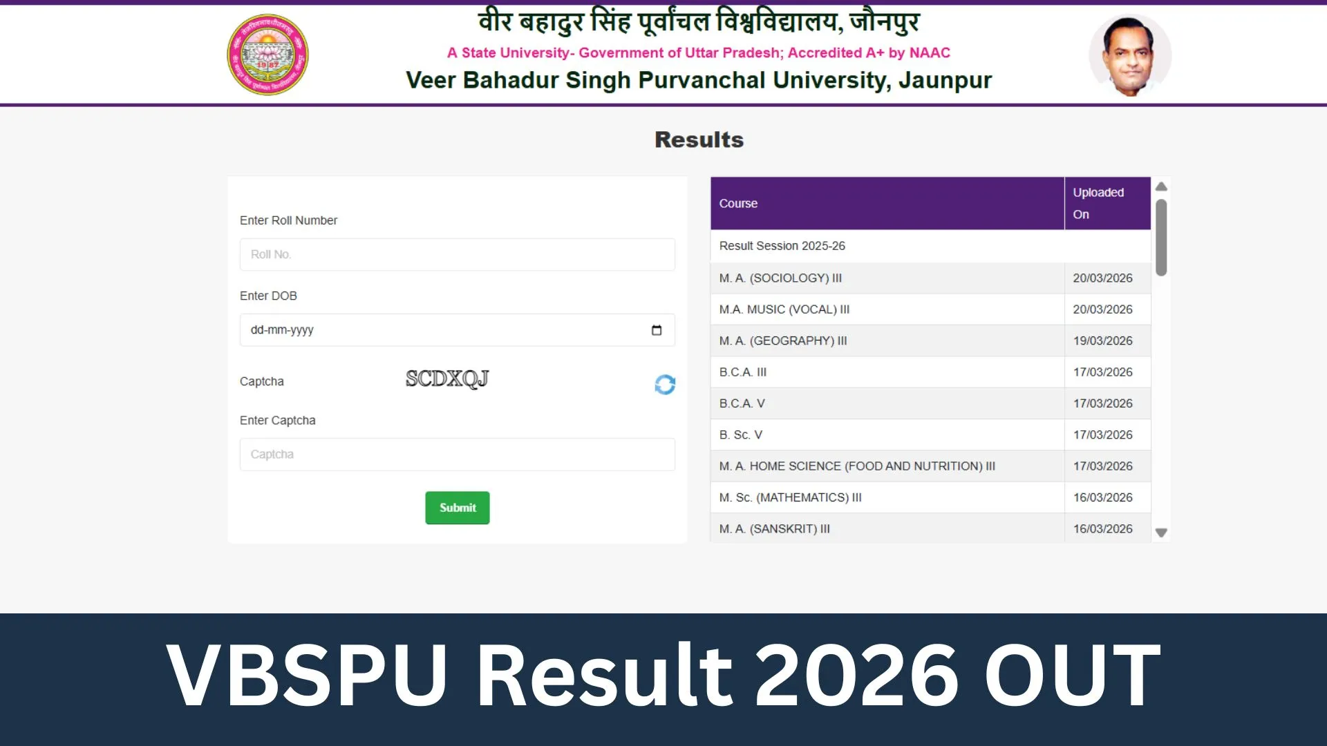 VBSPU Result 2026 OUT: वीर बहादुर सिंह पूर्वांचल विश्वविद्यालय (VBSPU) ने MA Economics, MA Hindi, MA Visual Arts, MSc Home Science (Food and Nutrition), MJMC, BCom, BCom Banking/Insurance, BPEd, BBA Retail, BA, BA LLB, BBA, LLB, BSc, MSc Physics सहित कई UG और PG कोर्सों के ऑड सेमेस्टर के नतीजे घोषित कर दिए हैं।