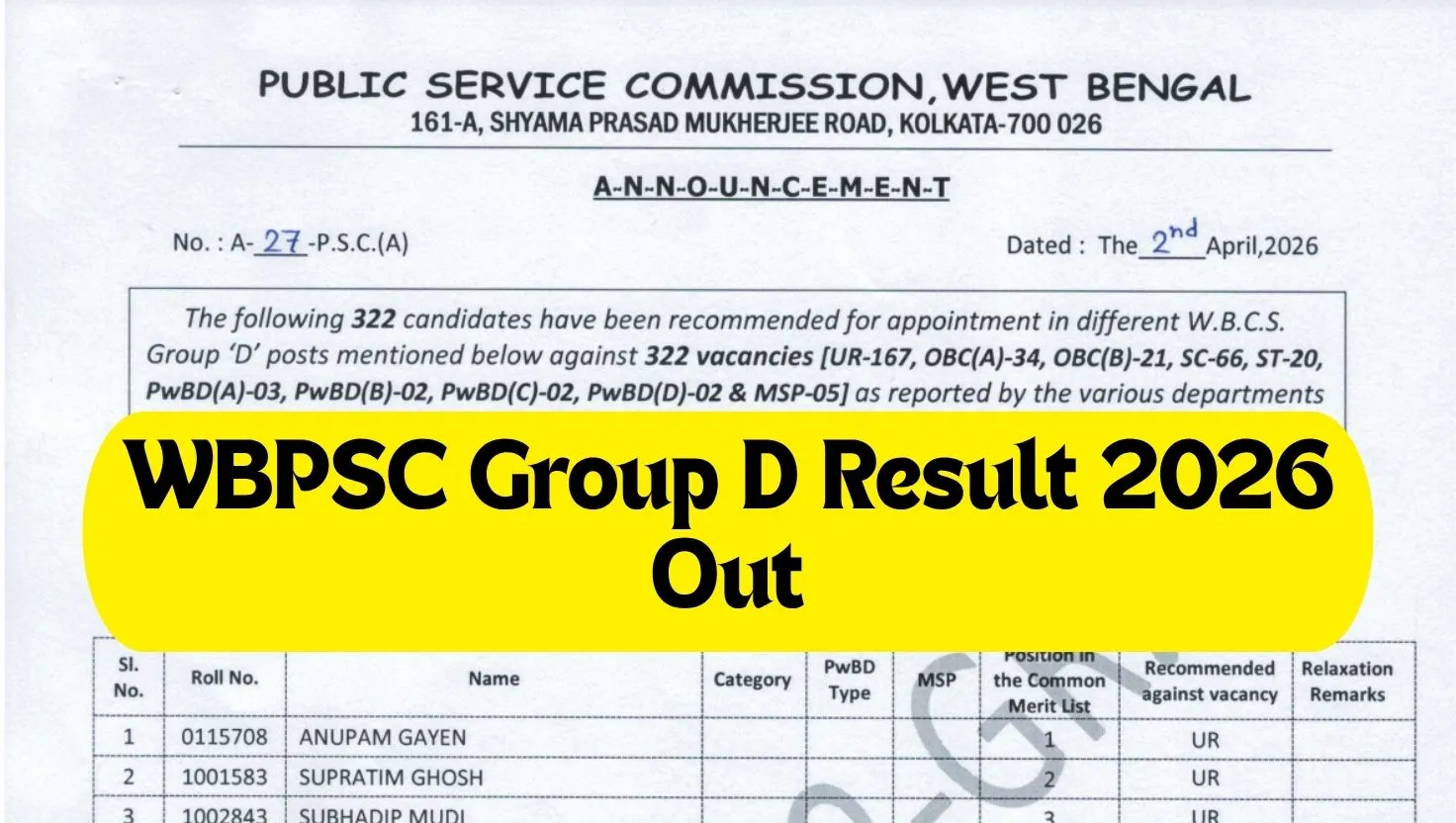 | WBCS Group D Result 2026 |