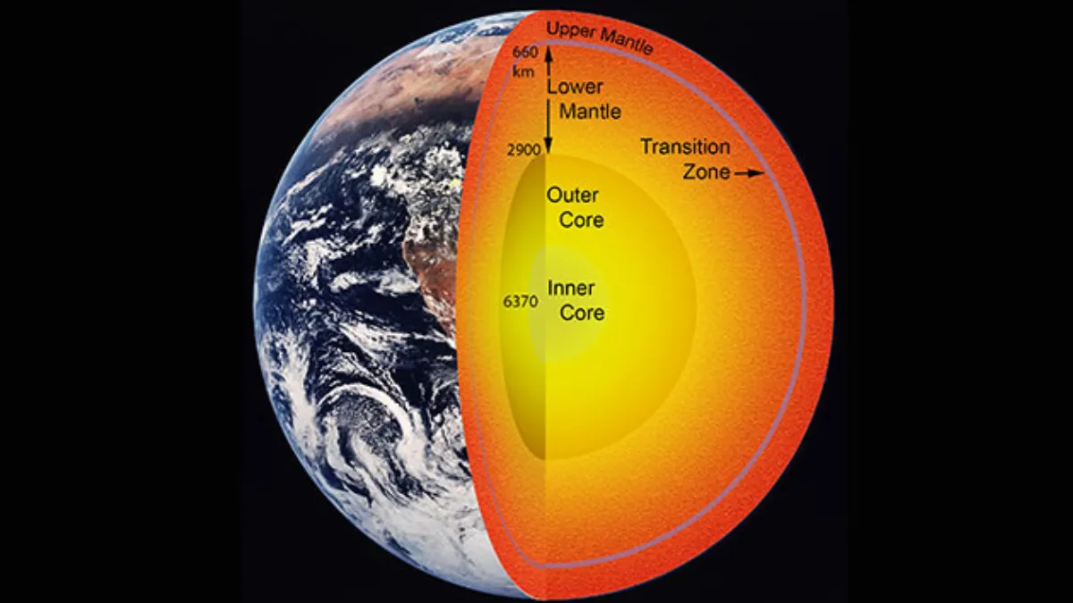 A water-saturated domain in the mantle transition zone, the depth of which is estimated to be between 410 km and 660 km, has been found in which some minerals are capable of holding large quantities of hydrogen and water in the crystal structure.