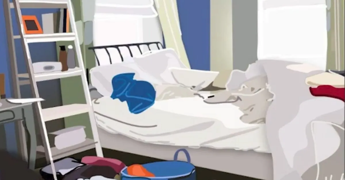 Look at the image below. At first glance, you will see what looks like a messy bedroom that is filled with clothes, objects, and things scattered around. Pretty ordinary, right?