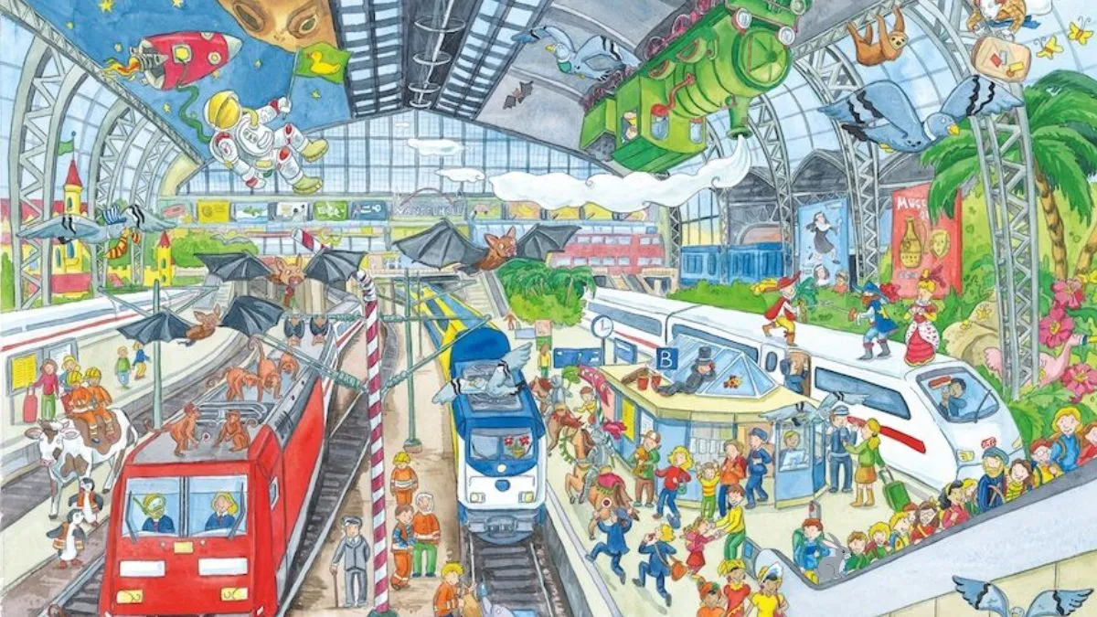 इस तस्वीर को आप गौर से देखेंगे, तो पाएंगे कि तस्वीर में रेलवे स्टेशन बना हुआ है। यहां अलग-अलग रेलवे ट्रैक्स पर ट्रेनें खड़ी हुई हैं। कुछ इसी तरह की तस्वीर रेलवे स्टेशन की ऊपरी छत पर बनी हुई है। रेलवे स्टेशन पर ट्रेनों के साथ-साथ हरियाली, विभिन्न प्रकार के पशु-पक्षी और एस्ट्रोनॉट भी शामिल है। इस वजह से यह तस्वीर पूरी तरह भरी हुई दिख रही है।
