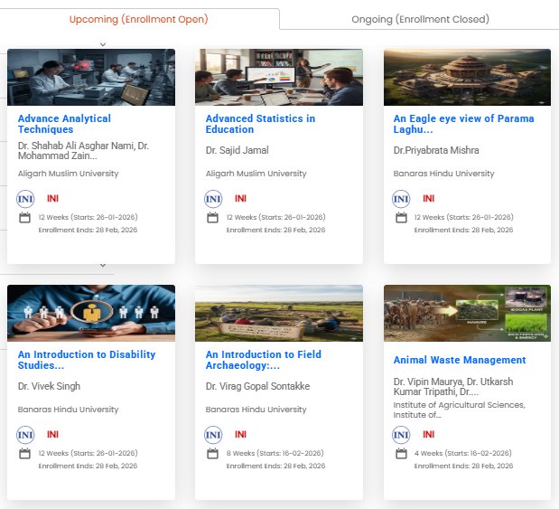 BHU ने इंस्टीट्यूट ऑफ नेशनल इंपोर्टेंस (INI) के तहत जनवरी 2026 सेशन के लिए 121 क्रेडिट-रेडी ऑनलाइन कोर्स लॉन्च करने की घोषणा की है। ये 121 स्किल डेवलपमेंट कोर्स SWAYAM पोर्टल पर लॉन्च किए जाएगा। SWAYAM केंद्रीय शिक्षा मंत्रालय का पोर्टल है, जो फ्री ऑनलाइन शिक्षा उपलब्ध है। BHU की तरफ से लॉन्च किए गए 121 स्किल डेवलपमेंट कोर्स में एडमिशन के लिए रजिस्ट्रेशन प्रक्रिया जारी है। रजिस्ट्रेशन बीएचयू SWAYAM पोर्टल पर जाकर किया जा सकता है। ये कोर्स 26 जनवरी और 16 फरवरी, 2026 से शुरू होने वाले हैं।