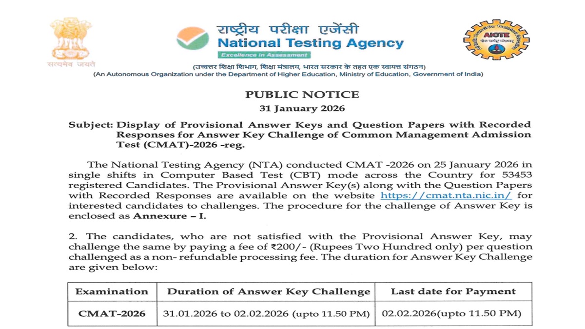 NTA has released the CMAT 2026 provisional answer key. Candidates who have appeared for the exams can submit objections on the answer key until February 2, 2026, at cmat.nta.nic.in
