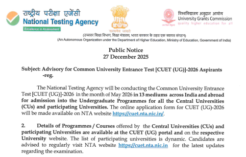 - NTA released an advisory for candidates preparing for the CUET UG 2026.