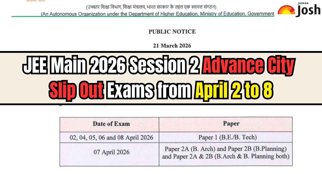 JEE Main 2026 Session 2 Advance City Intimation Slip has been released on 21 March by the National Testing Agency (NTA). As per the official update, the exams will be conducted on April 2, 4, 5, 6, 7, and 8, 2026, for candidates appearing in BE, BTech, BArch, and BPlanning courses.