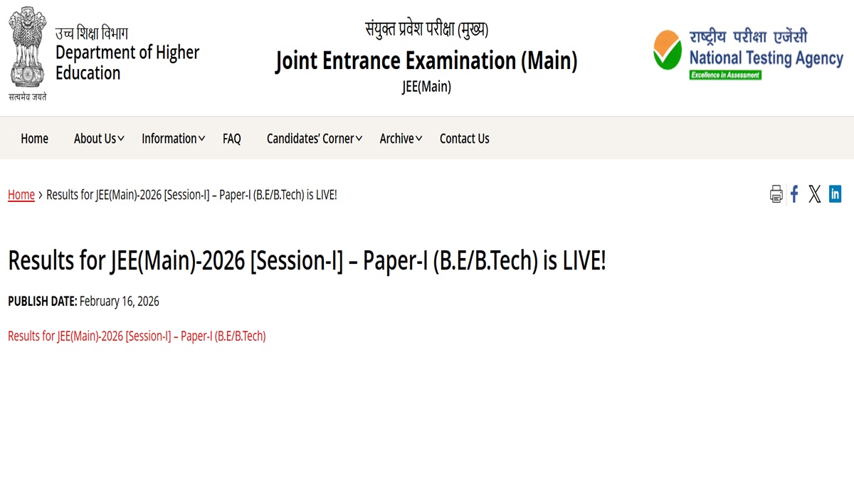 JEE Main 2026 Session 1 Result Declared: नेशनल टेस्टिंग एजेंसी (NTA) ने आज, 16 फरवरी 2026 को जेईई मेन 2026 सेशन 1 का रिजल्ट जारी कर दिया है। रिजल्ट देखने और जेईई मेन स्कोरकार्ड डाउनलोड करने का लिंक अब ऑफिशियल वेबसाइट पर उपलब्ध है। जिन छात्रों ने जेईई मेन 2026 जनवरी सेशन के एग्जाम दिए थे, वे अपना रिजल्ट देखने के लिए जेईई मेन की ऑफिशियल वेबसाइट पर जा सकते हैं।