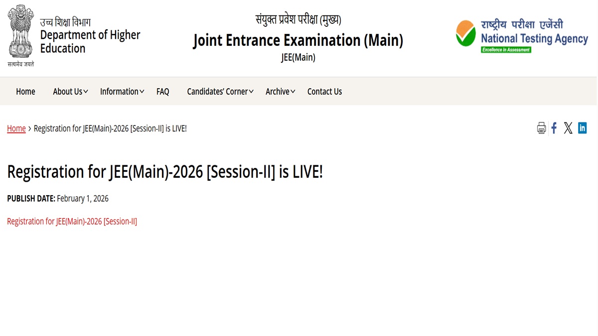 • NTA has commenced registrations for JEE Main 2026 Session 2 today, Feb 1, 2026