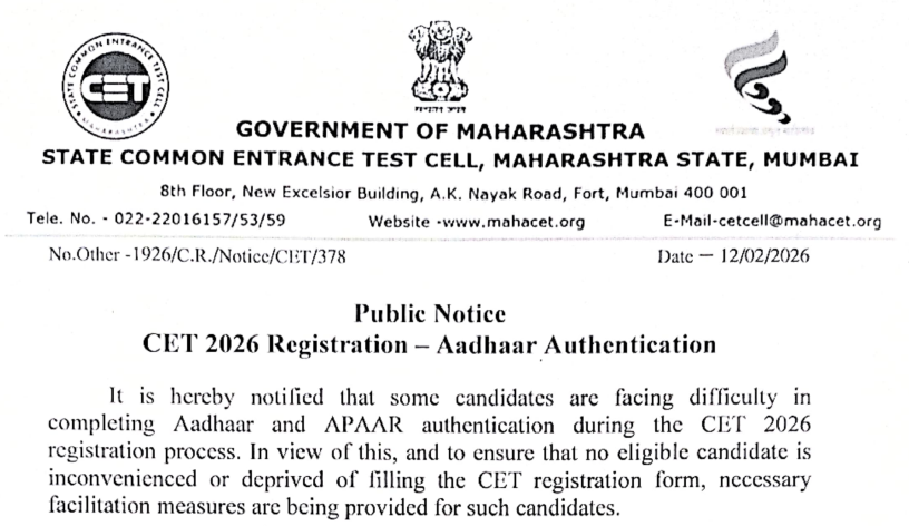The official notice reads, “Aadhaar authentication continues to be the preferred mode of verification for CET 2026 registration. Candidates who are unable to complete Aadhaar and APAAR authentication due to technical or other genuine issues may proceed with filling and submitting the application form on the CET 2026 registration portal without Aadhaar and APAAR authentication.”