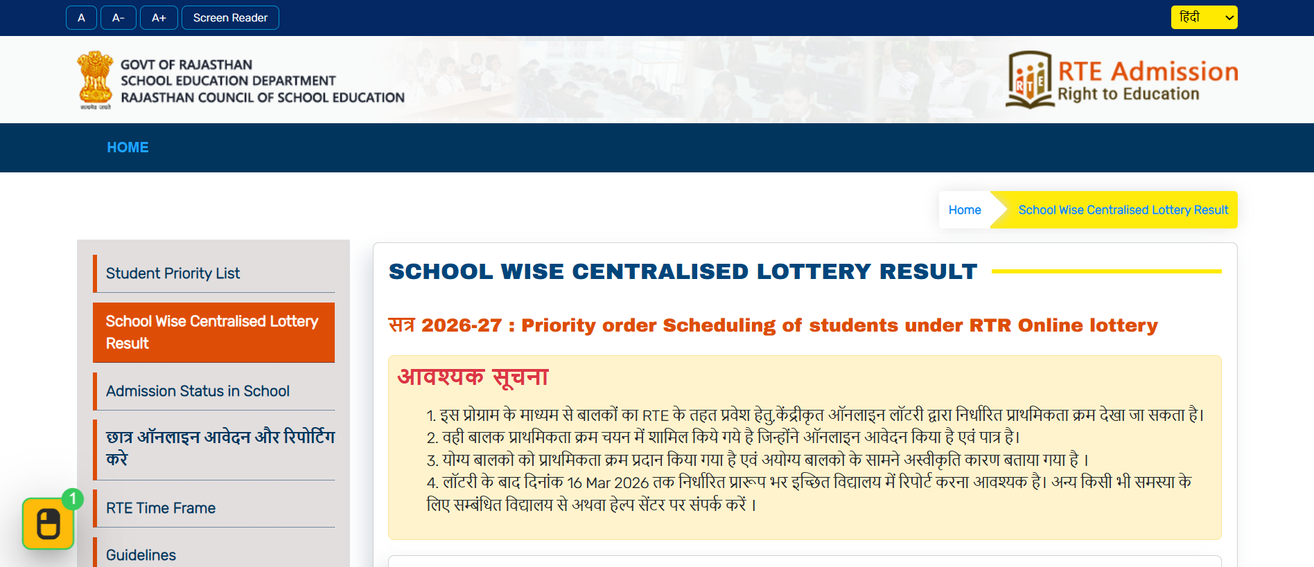 DIRECT LINK - Rajasthan RTE Lottery Result 2026